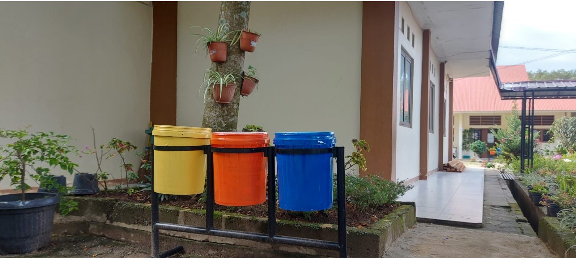 Sebanyak 30 tabung cat bekas dari asrama sekolah disulap menjadi 10 rakitan tong sampah, masing-masing terdiri dari tiga tabung yang dicat ulang dengan warna kuning, hijau, dan merah sebagai simbol pemilahan sampah organik, anorganik, dan B3 (bahan berbahaya dan beracun).